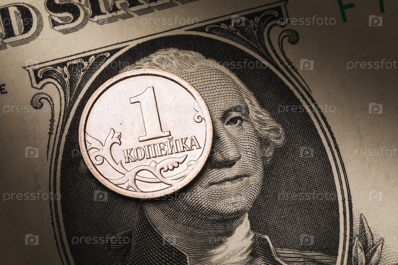 Одна российская копейка на фоне долларовой банкноты, крупный план