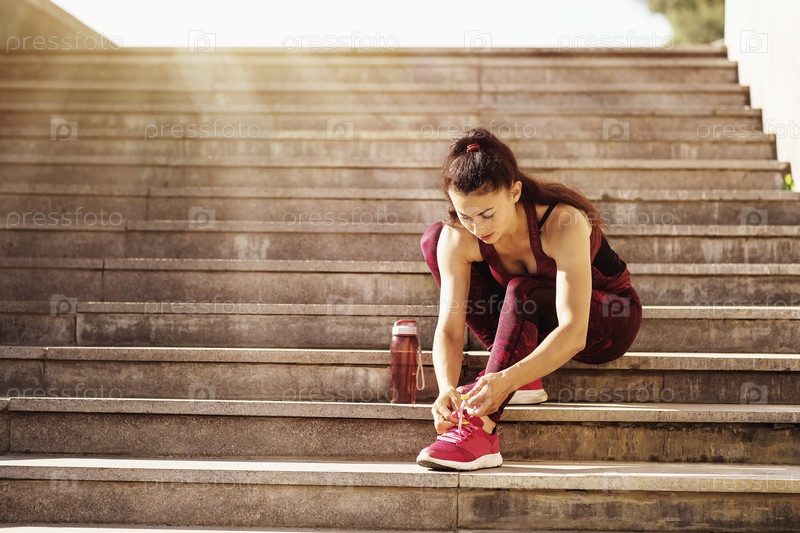 Спортсменка завязывает шнурки на кроссовках, сидя на подоконнике