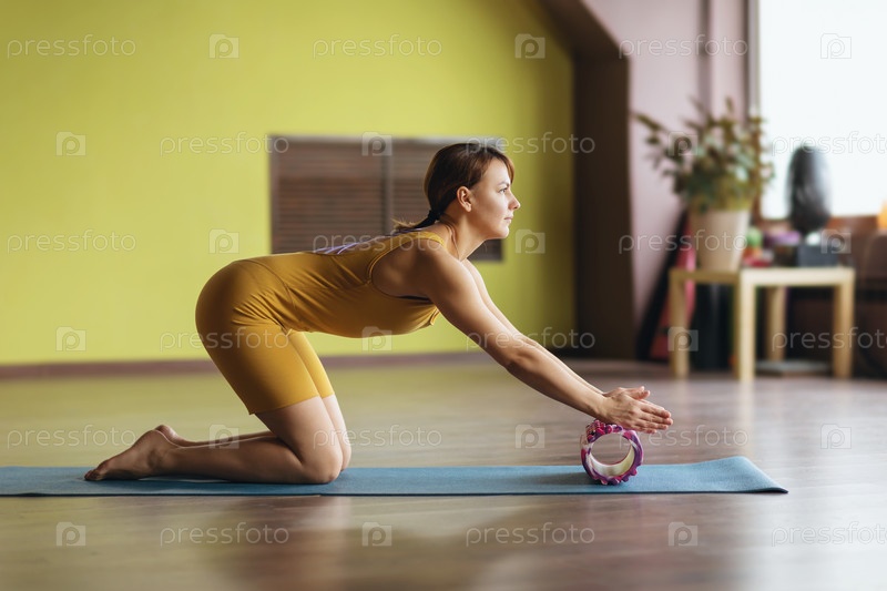 Женщина в спортивной одежде выполняет миофасциальный массаж мышц ладоней и предплечий валиком, тренируется на коврике в комнате