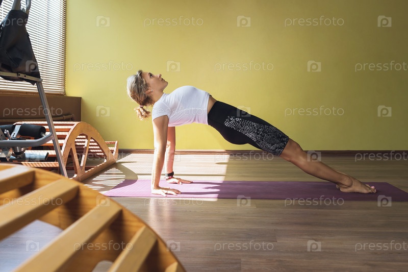 Женщина, практикующая йогу, выполняет упражнение пурвоттанасана в студии на коврике, поза перевернутой доски