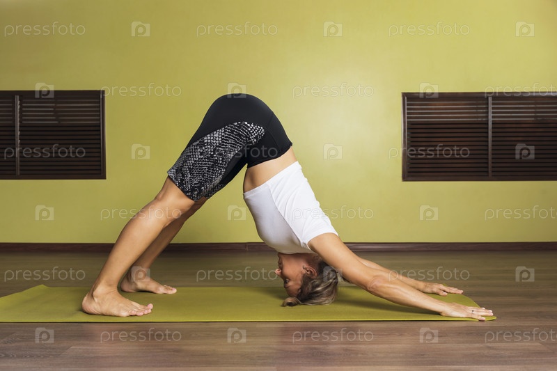 Женщина, занимающаяся йогой, выполняет в студии у стены упражнение Адхо Мукха Шванасана, поза собаки, лицом вниз