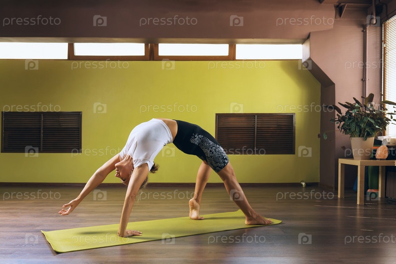 Женщина, ведущая здоровый образ жизни, занимающаяся йогой, выступает в студии, стоя на коврике, упражнение каматкарасана, поза танцующей собаки