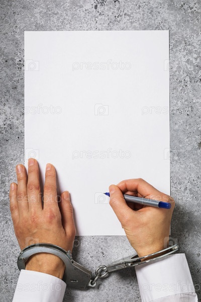 Женщина в наручниках подписывает пустой бланк. Концепция на тему согласия под влиянием давления на людей. Потерпевший подписывает документы