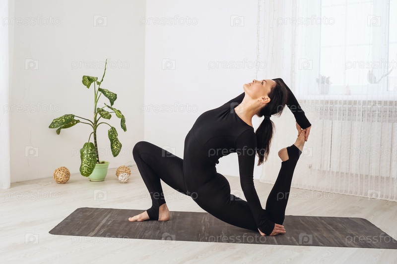 Женщина в черной спортивной одежде занимается йогой, делает вариацию упражнения Эка Пада Раджакапотасана, позу голубя, тренируется, сидя на коврике в пустой комнате у окна