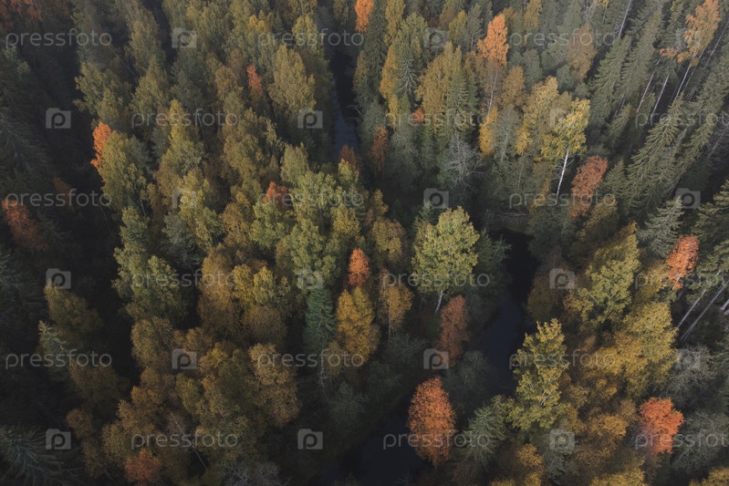 Небольшую речку можно увидеть в живописной лесной местности. Вид с дрона