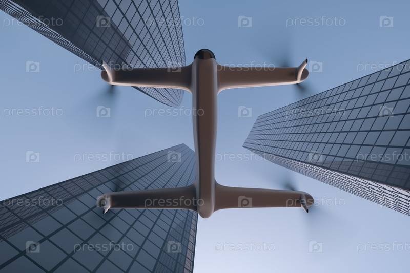 Летающий квадрокоптер между зданиями в мегаполисе