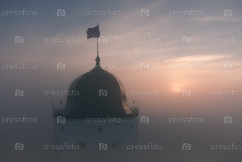 Вид с воздуха на башню древнего замка в Выборге, Россия. Туманное утро