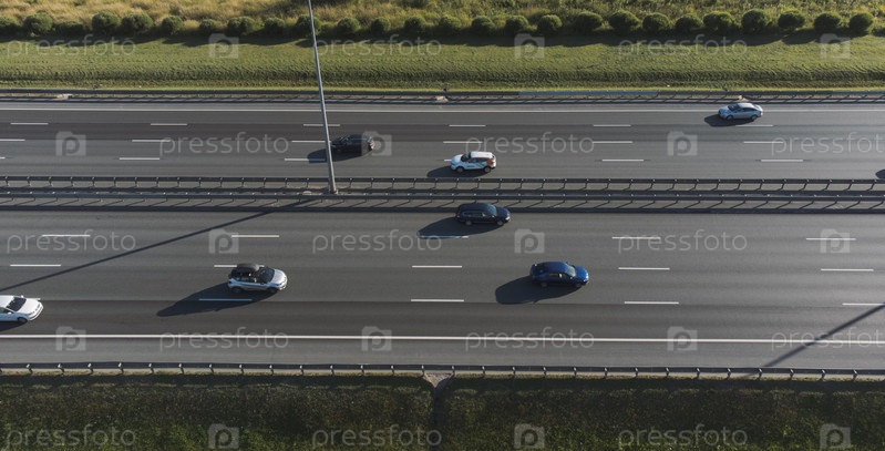 Движение автомобильного транспорта по многополосной магистрали. С высоты птичьего полета