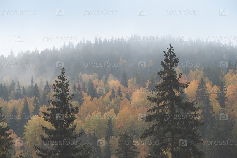 Лесной массив окрашен в осенние цвета. Туманное утро