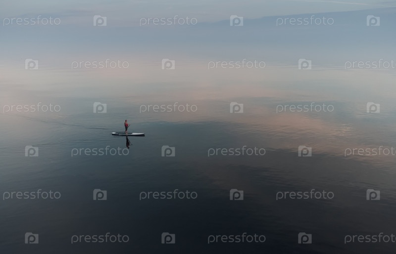 Суп-серфер плывет в открытом тихом море с высоты птичьего полета