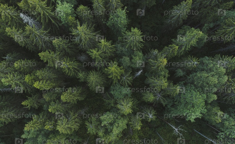 Лесистая местность. Пушистые хвойные и лиственные деревья. С высоты птичьего полета. Текстура леса
