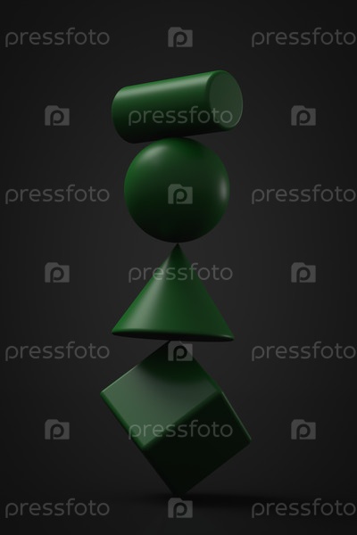 Геометрические фигуры (куб, конус, сфера и цилиндр) уравновешивают друг друга. Неустойчивое равновесие