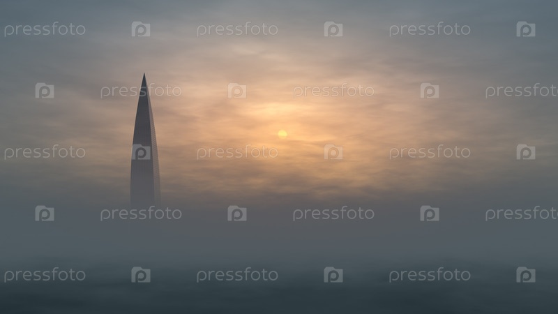 Небоскреб возвышающийся над туманом. Воздушный вид