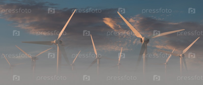 Ветряные электростанции в утреннем тумане. Чистая энергия