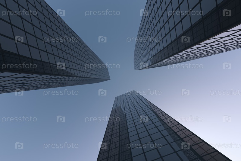 Башни небоскребов устремленные в небо. Нижний ракурс. Архитектура и недвижимость