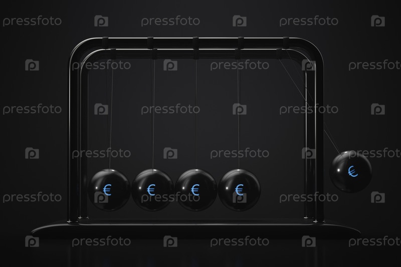 Маятник Ньютона в действии. Лого европейской валюты на шарах. Финансовая тематика