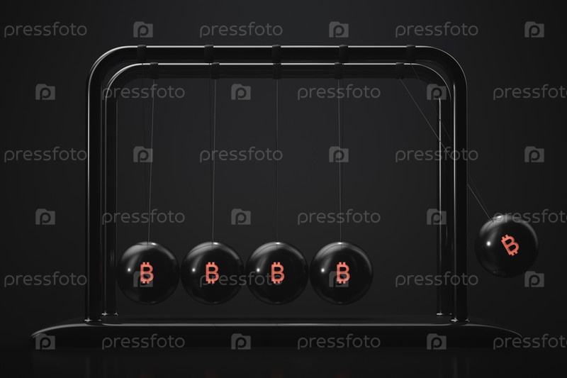 Иллюстрация на тему криптовалют. Маятник Ньютона с символикой биткоина