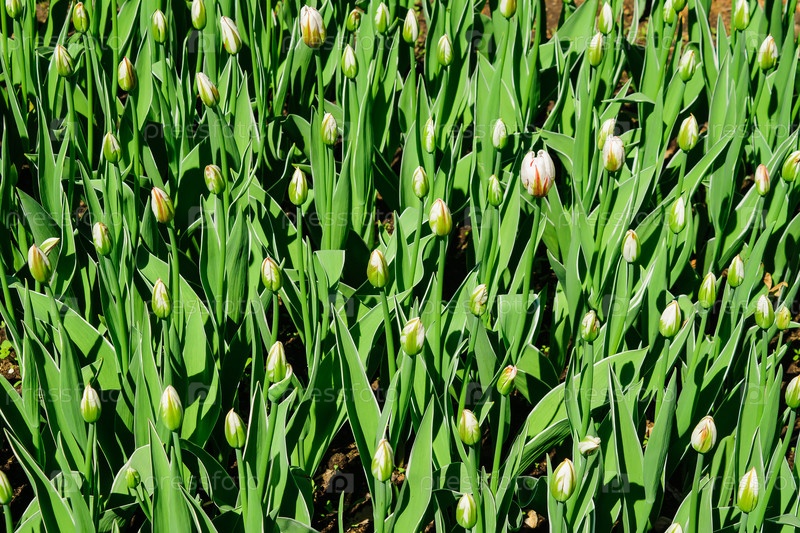 Естественный фон весенних цветущих цветов. Поле белых бутонов тюльпанов