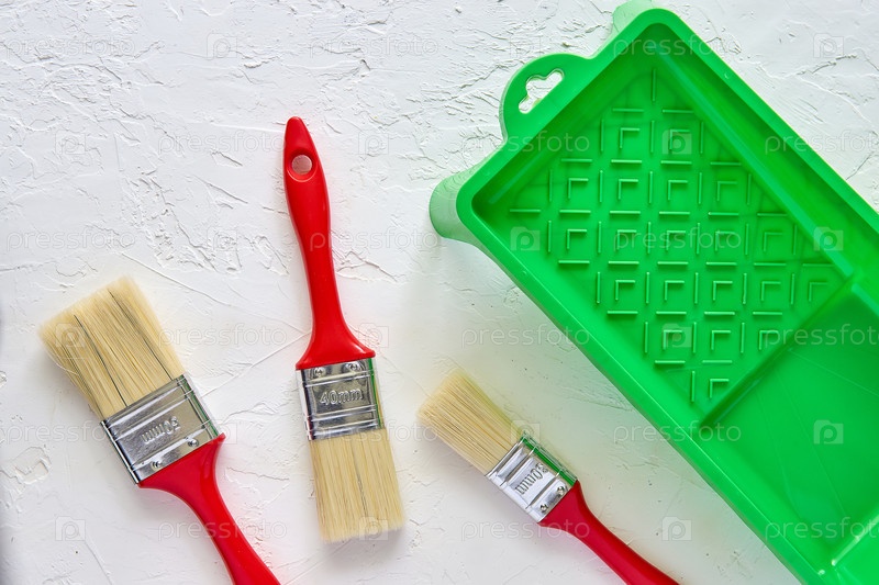 Три кисти с красными ручками и зеленый лоток для краски на белом бетонном фоне. инструменты и аксессуары для ремонта дома. Вид сверху