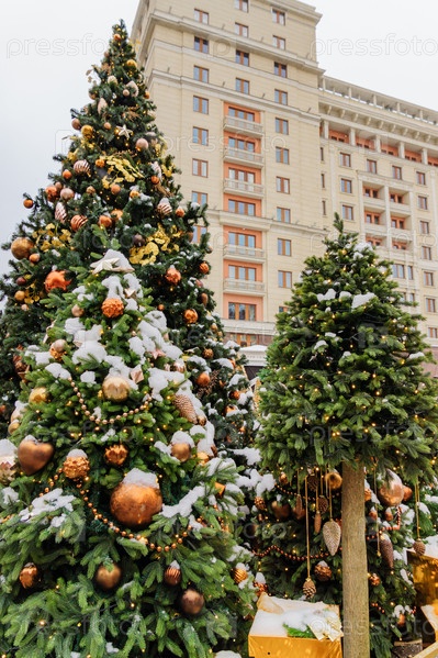 Закройте рождественские елки, украшенные сверкающими шарами и гирляндой с включенными огнями. Праздничное оформление улицы к зимним праздникам