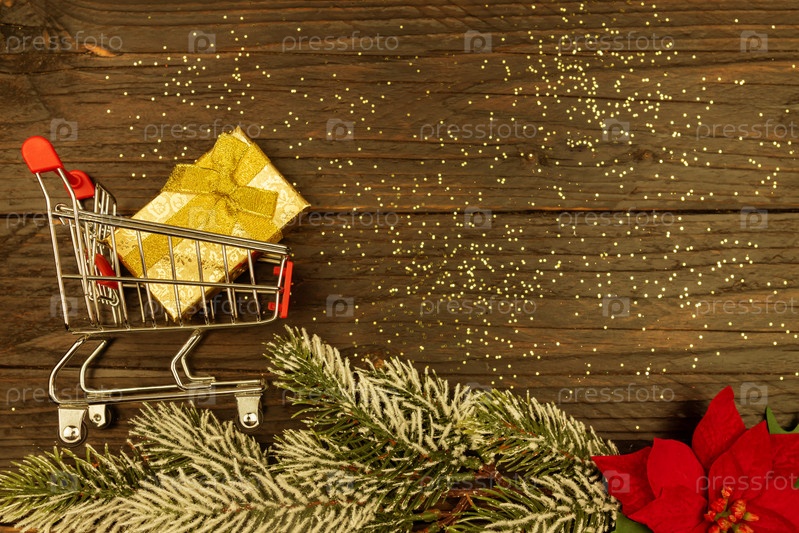 С Новым 2021 годом. корзина с золотой подарочной коробкой на деревянном фоне. Плоская планировка с копией пространства