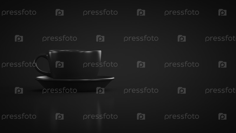 Черная кружка с блюдцем на черном фоне. Копировать пространство
