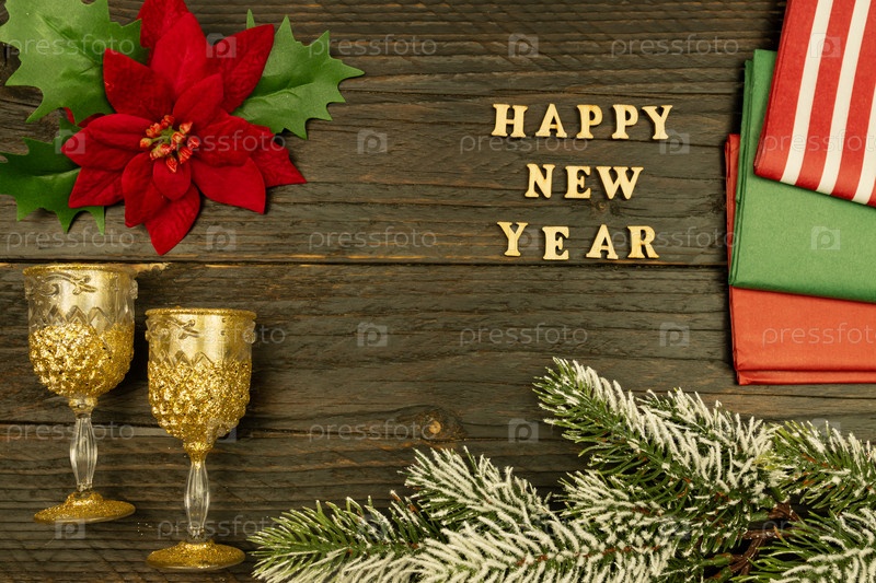 С Новым 2021 годом. Бокалы для шампанского и пуансеттия на деревянном фоне. Плоская укладка