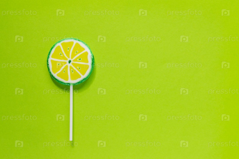 Сладкий вкусный леденец в форме ломтика лайма на зеленом фоне. Минимальная плоская планировка с копировальным пространством