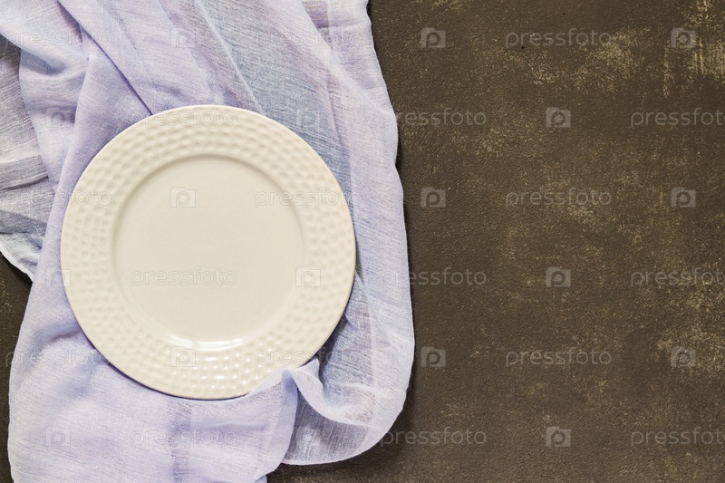 Вид сверху на пустую тарелку, серый текстиль на черном бетонном фоне. Скопируйте пространство
