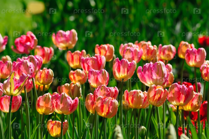 Поле цветущих розовых тюльпанов. Цветочный фон. Пейзаж летнего сада