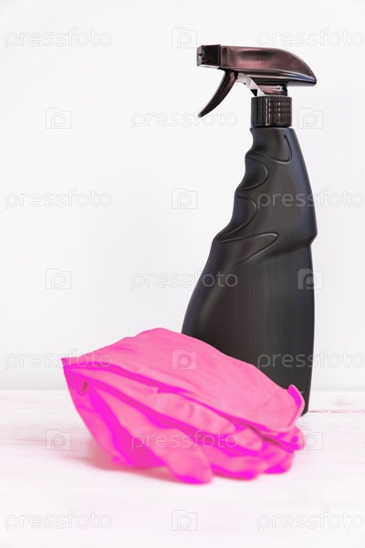 Черная пустая пластиковая бутылка с моющим средством и розовые резиновые перчатки на белом фоне. Бытовая химия. Чистящее средство