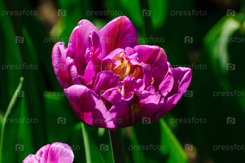 Закройте фиолетовый тюльпан. Цветочный фон. Пейзаж летнего сада