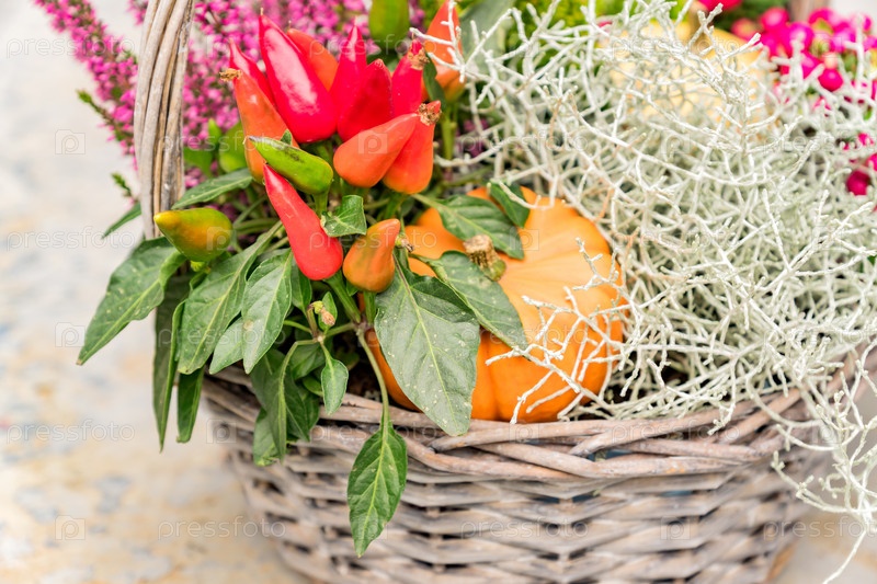 Осенняя декоративная композиция в плетеной корзине - оранжевый декоративный тыква, перец, Pernettya mucronata, собраны вместе