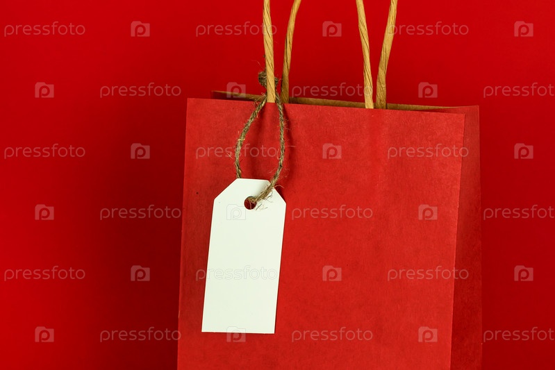 Один красный бумажный пакет для покупок на красном фоне. Черная пятница монохромная концепция. Макет