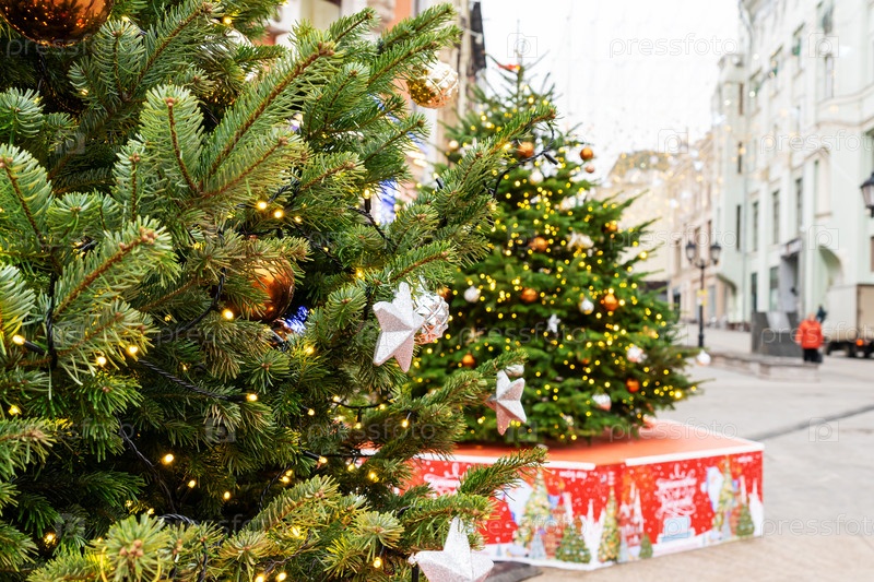 Закройте украшение елки игрушками и гирляндами. Праздничный декор города во время зимних праздников