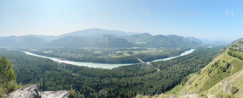 Густой лес в долине, на фоне гор