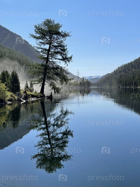 Одинокое дерево и высокие заснеженные вершины отражаются в гладкой поверхности озера Алтай, Россия