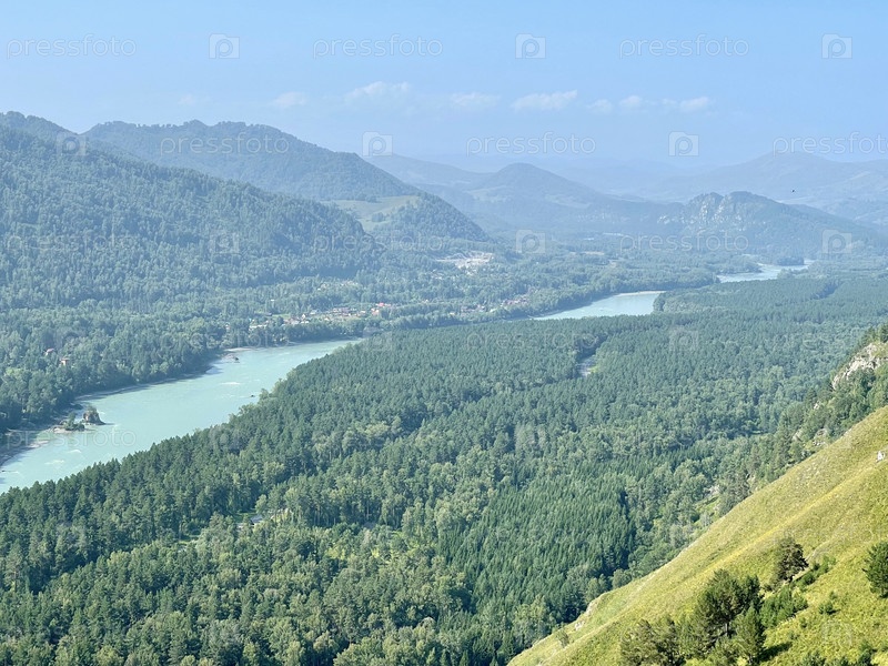 Густой лес в долине, на фоне гор