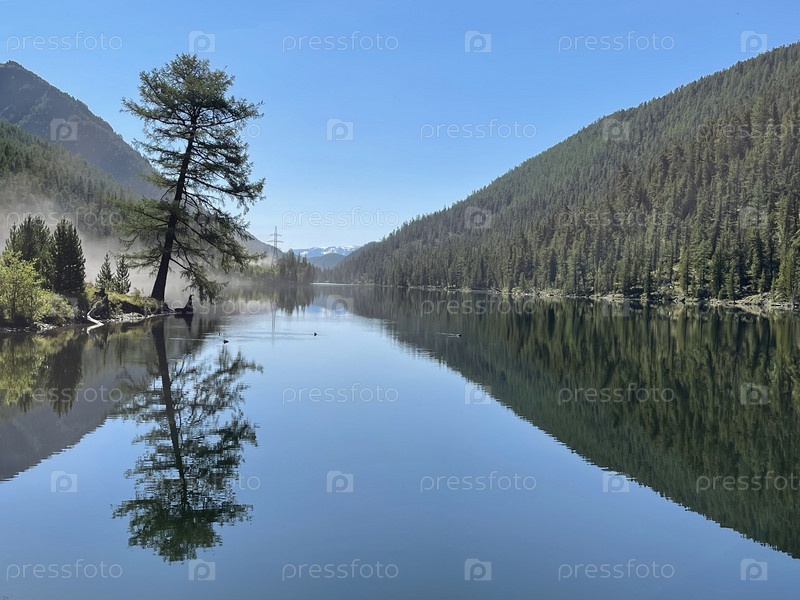 Одинокое дерево и высокие заснеженные вершины отражаются в гладкой поверхности озера Алтай, Россия