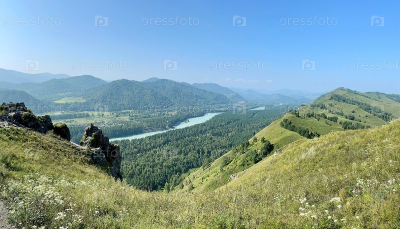 Густой лес в долине, на фоне гор