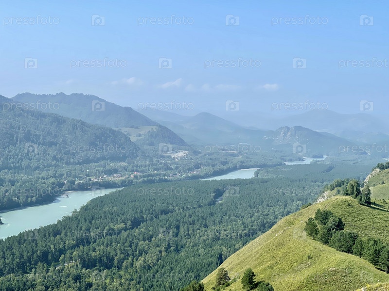 Панорамный вид на заросшую деревьями горную долину и реку Катунь, залитую ярким солнцем, Алтай, Россия