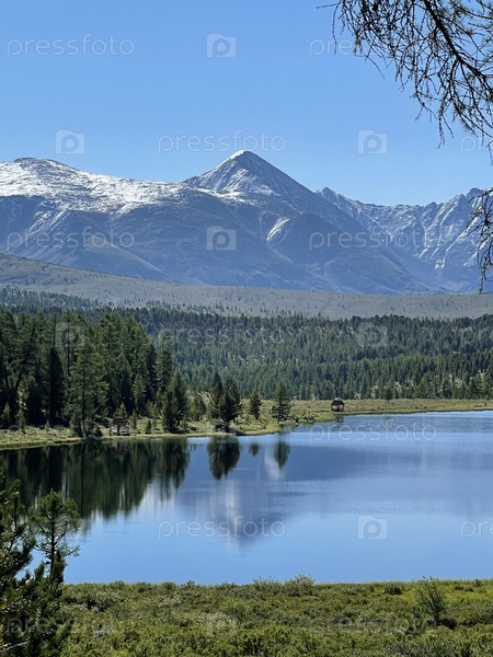 Горное озеро и высокие заснеженные вершины Алтая, Россия