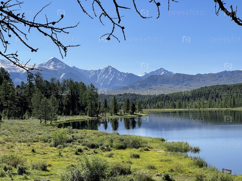 Горное озеро и высокие заснеженные вершины Алтая, Россия