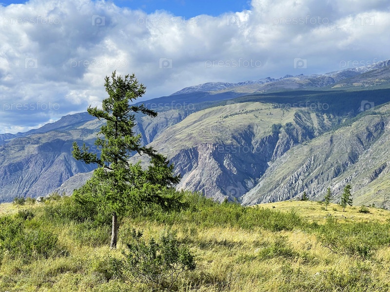 Красивый пейзаж в горах Алтая, вид на долину и одинокое дерево, Россия