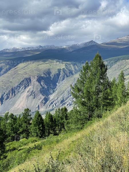 Пейзаж в горах Алтая, вид на долину и сосны, Россия