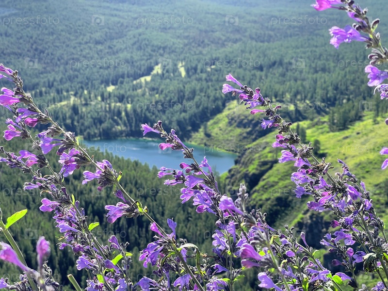 Фиолетовые полевые цветы на фоне горного озера, Алтай, Россия