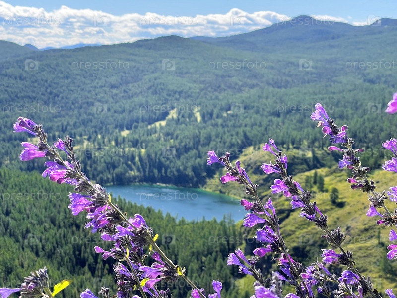 Фиолетовые полевые цветы на фоне горного озера, Алтай, Россия
