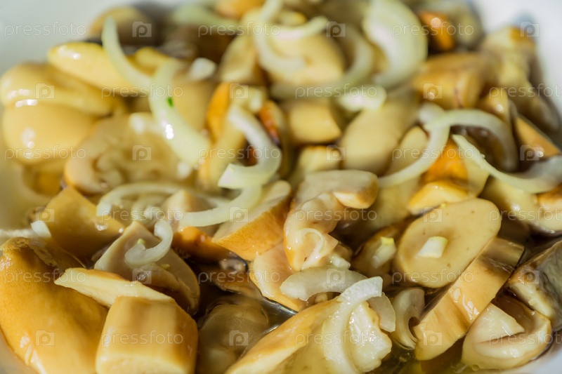 Маринованные нарезанные грибы и лук в белой миске. Ферментированная пища. Подберезовик