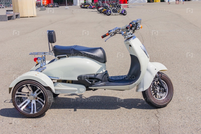 Сочи Адлер, Россия - 7 сентября 2019 г.: Крупный план трехколесного электроскутера, припаркованного в аренду