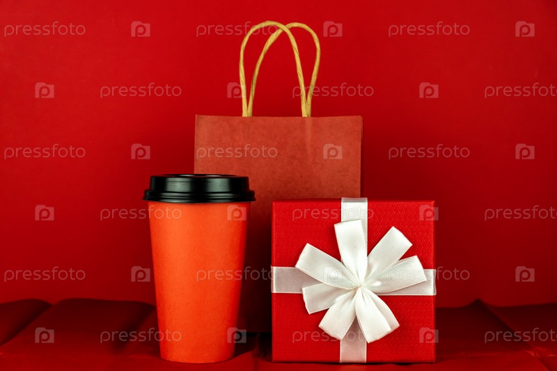 С Новым 2021 годом, рождественские покупки. Подарочная коробка, бумажный пакет и чашка кофе на красном фоне, монохромный